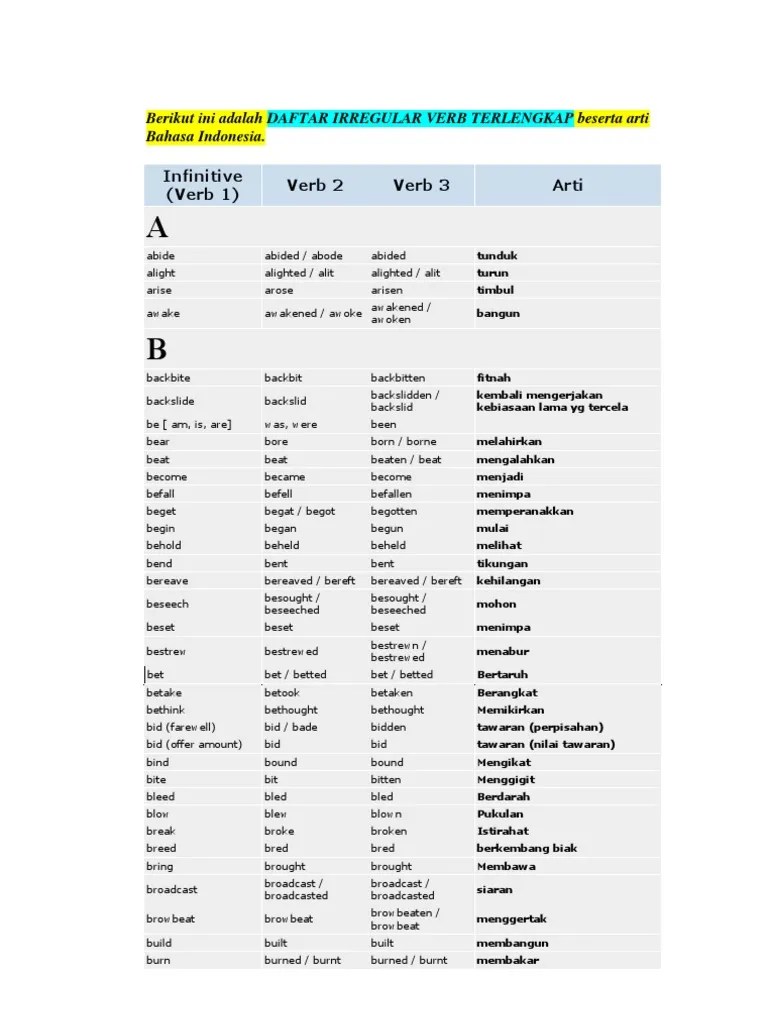 Ada verb 1, verb 2, dan verb 3 atau yang kemudian terkenal dengan sebutan verb123. Kata kerja beraturan (regular verb) sudah disebutkan jika setiap kata kerja yang berubah dari verb 1 ke verb 2 lalu kemudian berubah menjadi kata kerja verb . Apabila kata kerja berakhiran huruf vokal ( . Daftar contoh verb 123 v1 v2 v3 beserta artinya lengkap verb 1 2 3 kata read . Excellent resource for students and teachers.